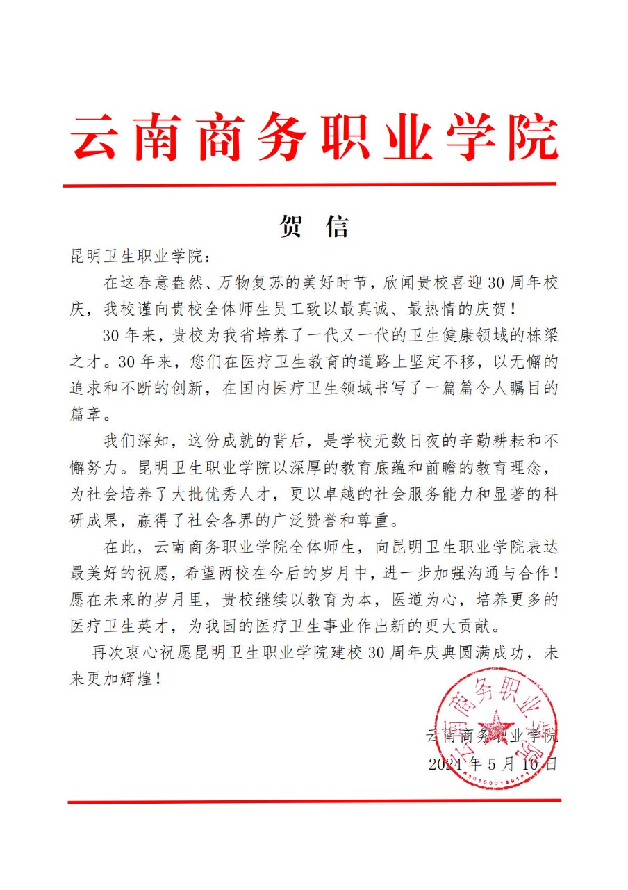 云南商务职业学院致昆明卫生职业学院建校30周年贺信