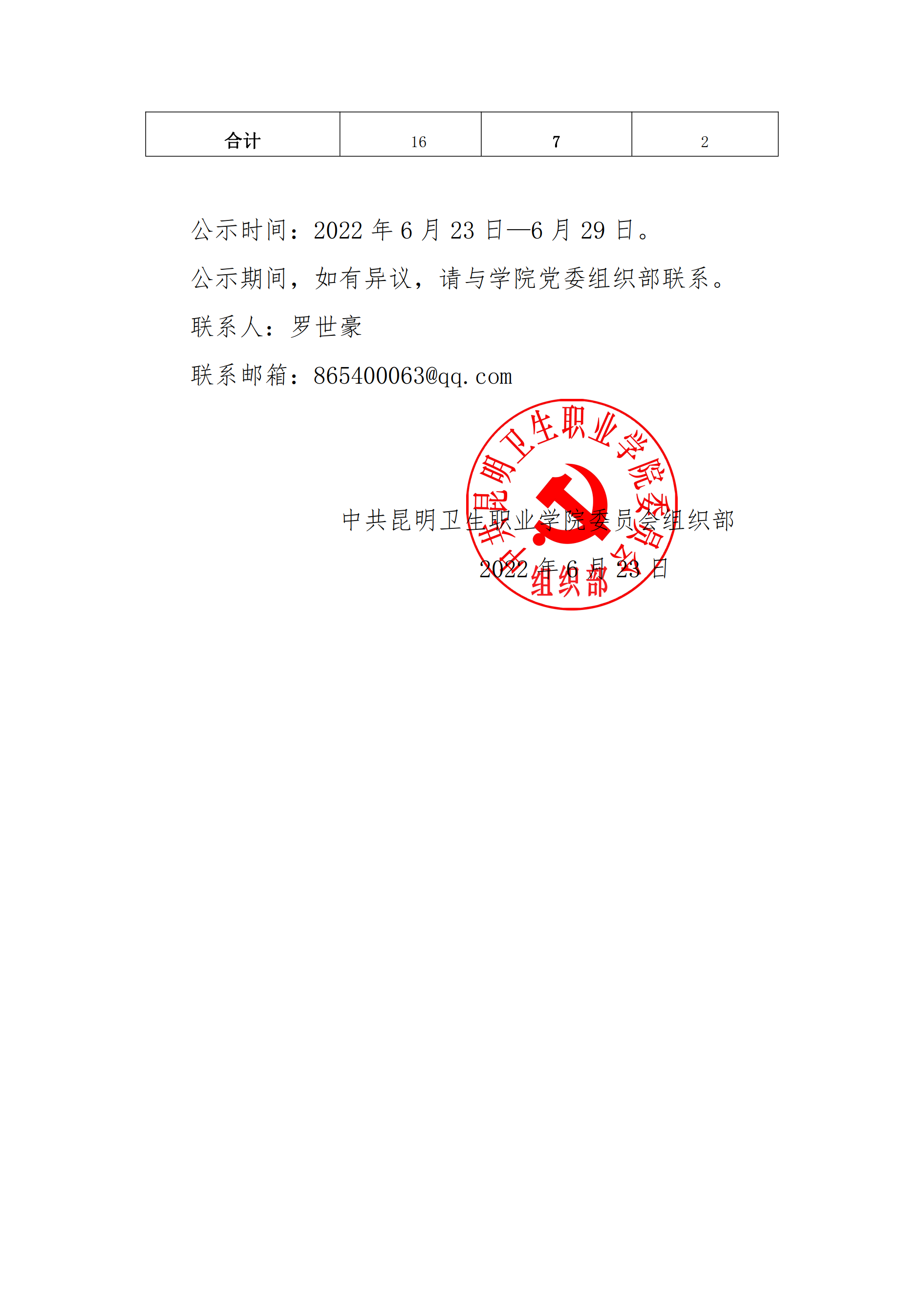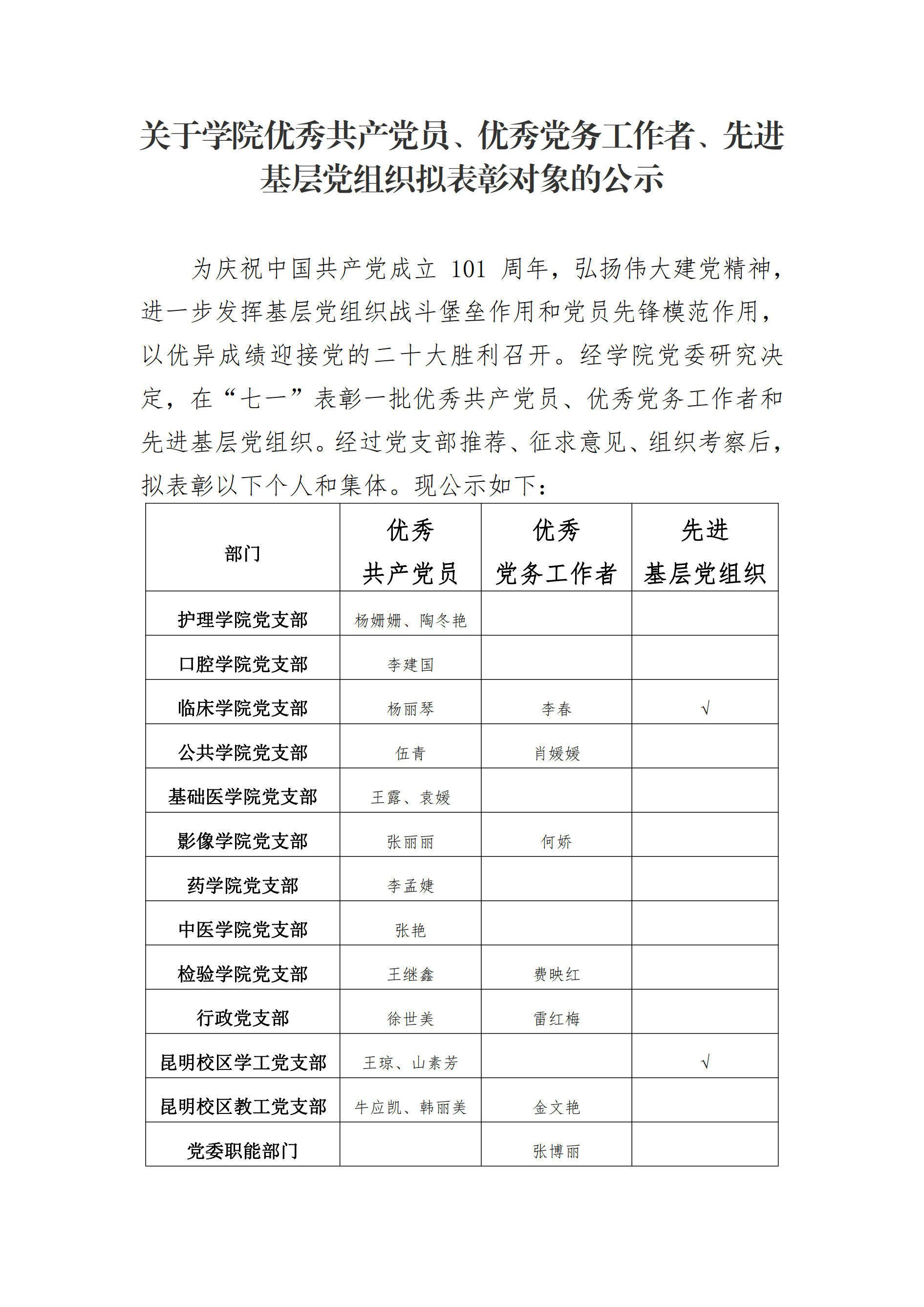 关于学院优秀共产党员、优秀党务工作者、先进基层党组织拟表彰对象的公示