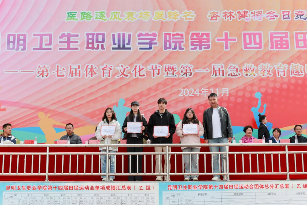 下午两点,闭幕式在足球场举行。云南泓旻教育投资管理集团董事长、昆明卫生职业学院理事长龙正昌,学院党委书记(督导专员)马季昕,副院长张尤松、陈举国,党委委员王斌、张艳,以及各二级学院院长、职能处室负责人出席并在主席台就坐。闭幕式由张尤松副院长主持。