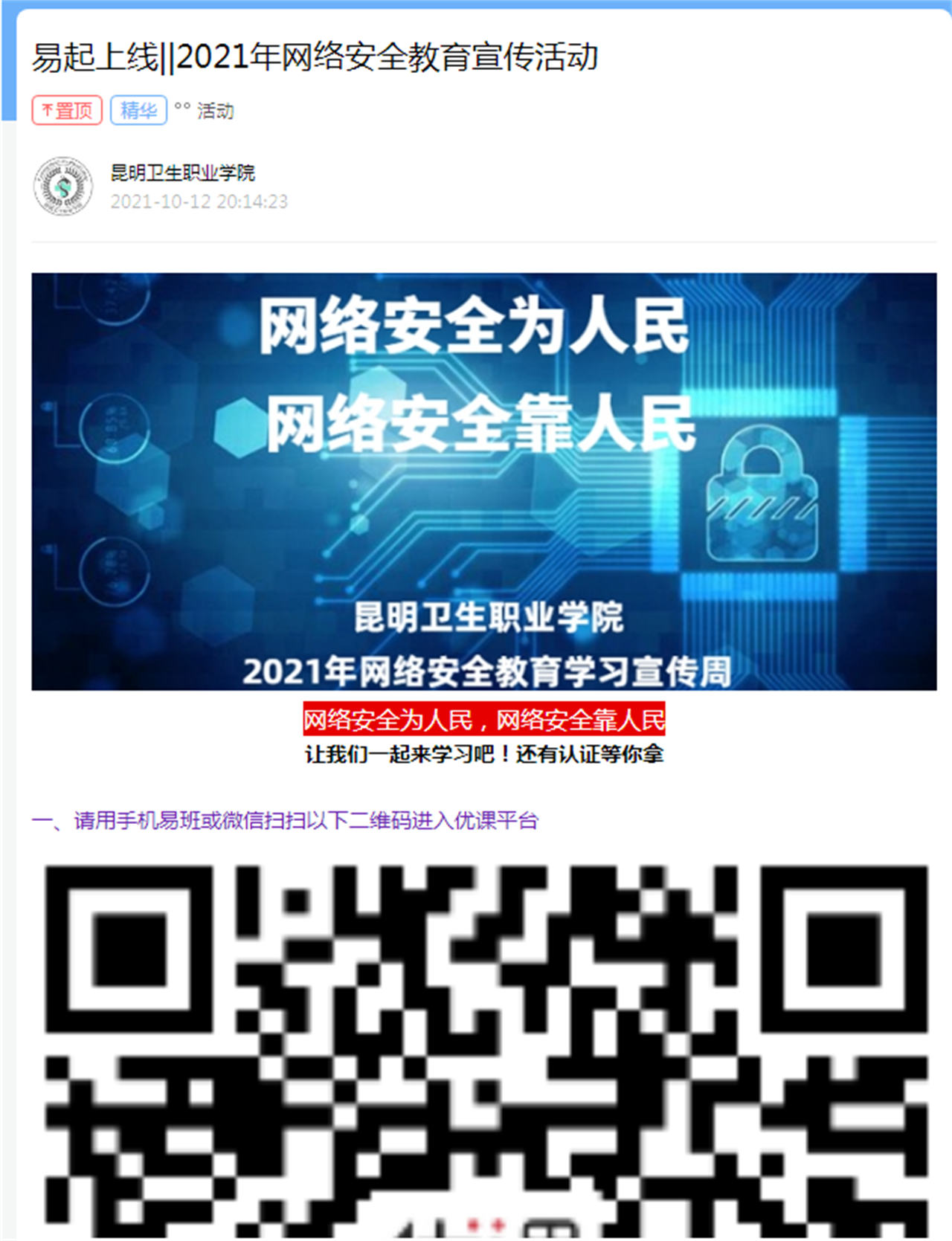 10月12-14日,昆明卫生职业学院围绕“网络安全为人民,网络安全靠人民”这一主题,多措并举在全院范围内开展2021年国家网络安全宣传周系列宣传教育活动,大力营造网络安全周浓厚宣传氛围。