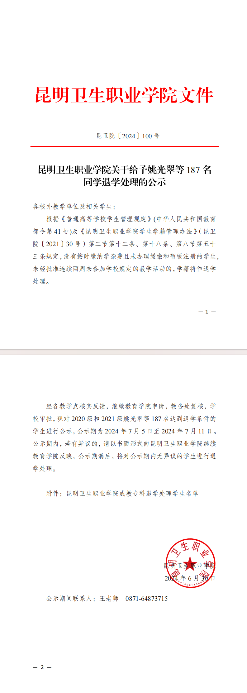 昆明卫生职业学院关于给予姚光翠等187名同学退学处理的公示