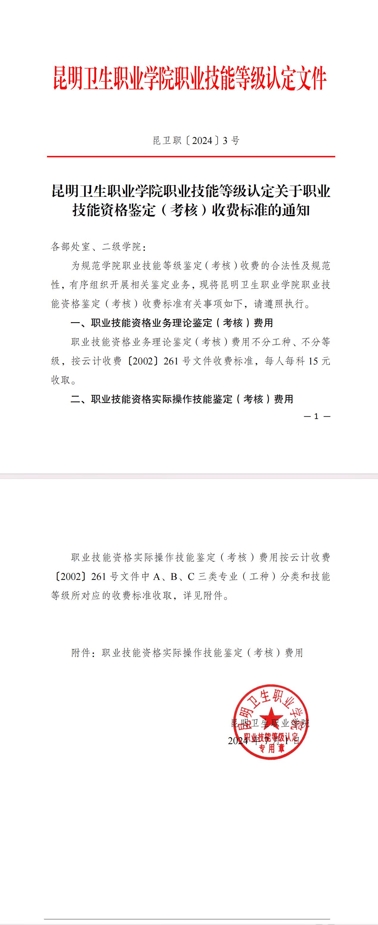 昆明卫生职业学院职业技能等级认定关于职业技能资格鉴定(考核)收费标准的通知