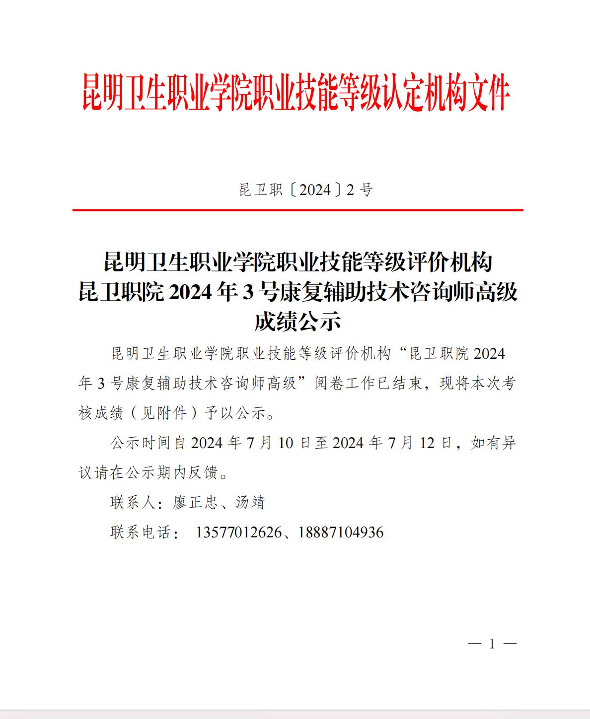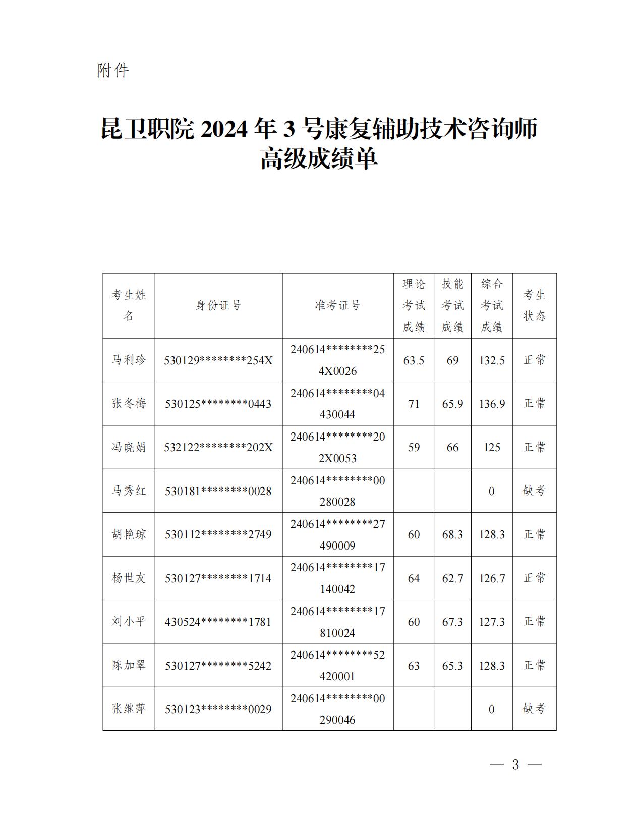 昆明卫生职业学院职业技能等级评价机构昆卫职院2024年3号康复辅助技术咨询师高级成绩公示