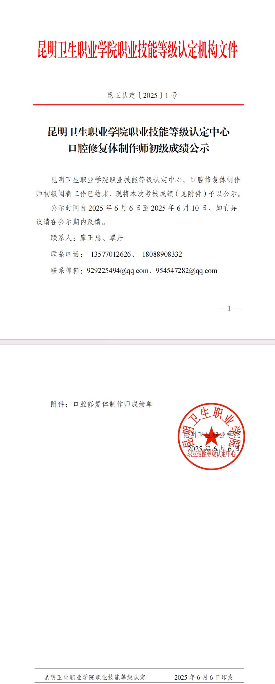 昆卫认定2025-1号文件-口腔修复体制作师初级成绩公示