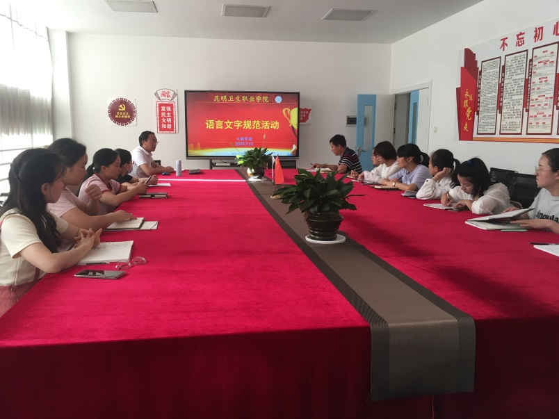 口腔学院副院长张晓刚带领大家学习语言文字方针政策、法律法规以及昆明卫生职业学院语言文字应用管理规定,昆明卫生职业学院标牌、宣传栏用字规范检查标准,并组织了教师对口腔学院室内外宣传栏进行检查。