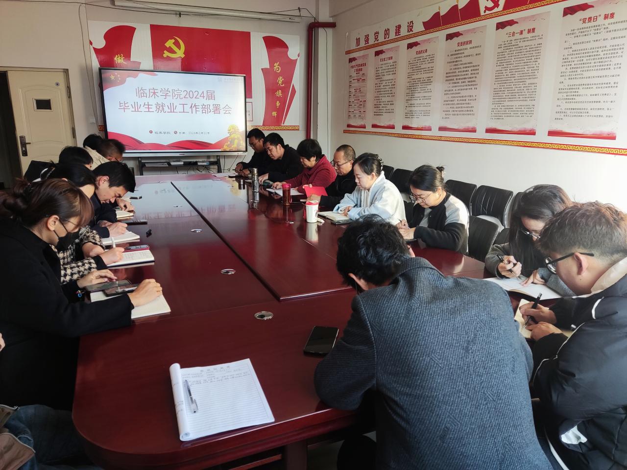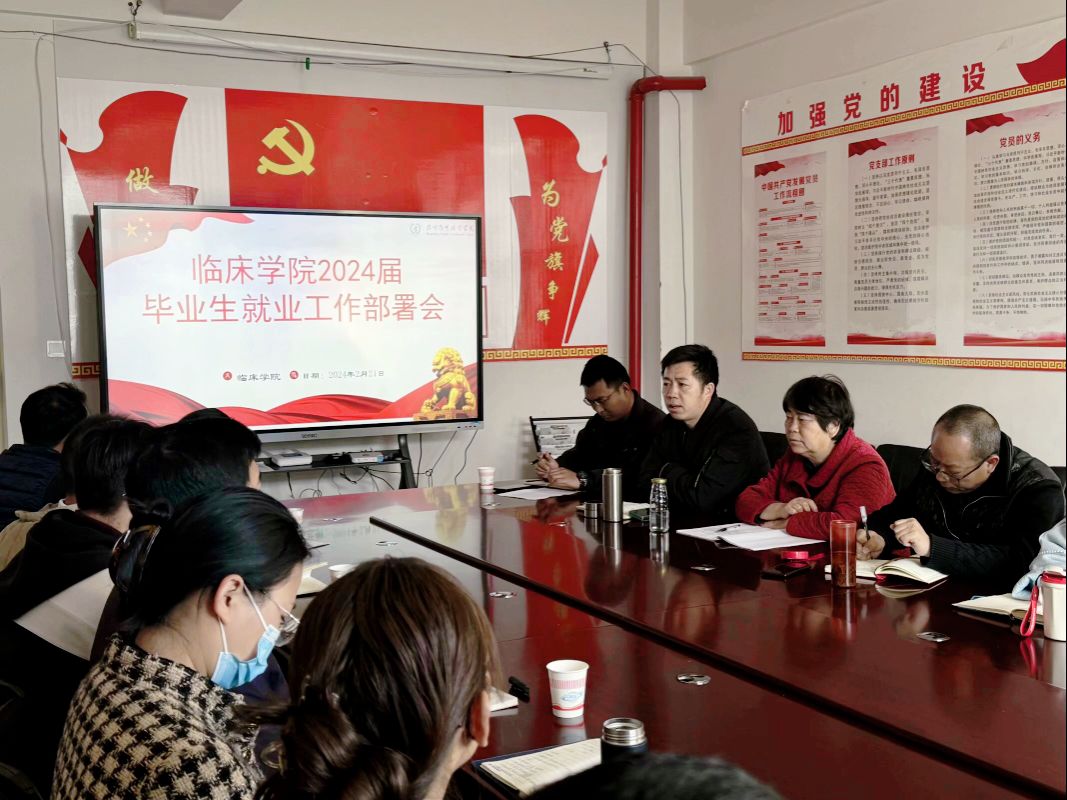 就业是最大的民生,是社会稳定的重要保障。为深入学习贯彻党的二十大精神,以习近平新时代中国特色社会主义思想为指导,全力推动2024届毕业生高质量充分就业。临床学院于2月21日在临床学院405党员活动室组织召开2024届毕业生就业工作部署会,临床学院党政领导班子出席会议,2024届全体辅导员参加会议,本次会议由临床学院学管办李莉老师主持。