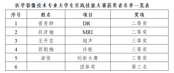 在学院各级领导关心指导下,影像专业全体教师参与,制定竞赛方案,不断研讨,定向指导学生,学生也不负众望,刻苦训练,最终,我院医学影像技术专业学生在MRI、DR检查技术项目中获二等奖,在医学影像诊断、超声检查技术项目中获三等奖,教学创新大赛中也荣获三等奖。同时,我院团队以整体实力荣获团体第三名。
