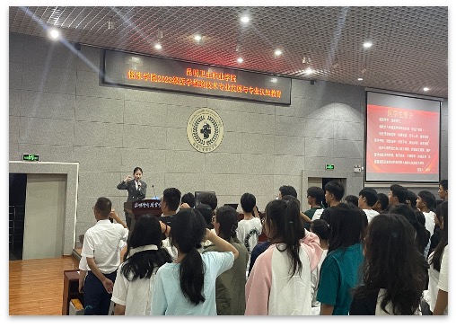 首先,张院长对2023级医学检验技术专业的新生的到来表示热烈的欢迎和祝贺。通过对专业概况、就业方向和趋势、未来目标、大学计划等方面的介绍,着重讲解了医学检验技术专业现状及学院在学生特色培养方面的思路以及学生职业发展的方向选择。使学生对于专业和未来三年的学习有了更清晰的规划。张院长希望同学们严格遵守学院的各项纪律,刻苦学习,努力参加专业各项技能大赛,希望同学们尽快的找到适合自己的学习方法,学会适应大学的学习和生活,给自己做出一个好的规划,为人生目标做个定位。最后,本次讲座在同学们激情高昂的医学生誓言中结束。