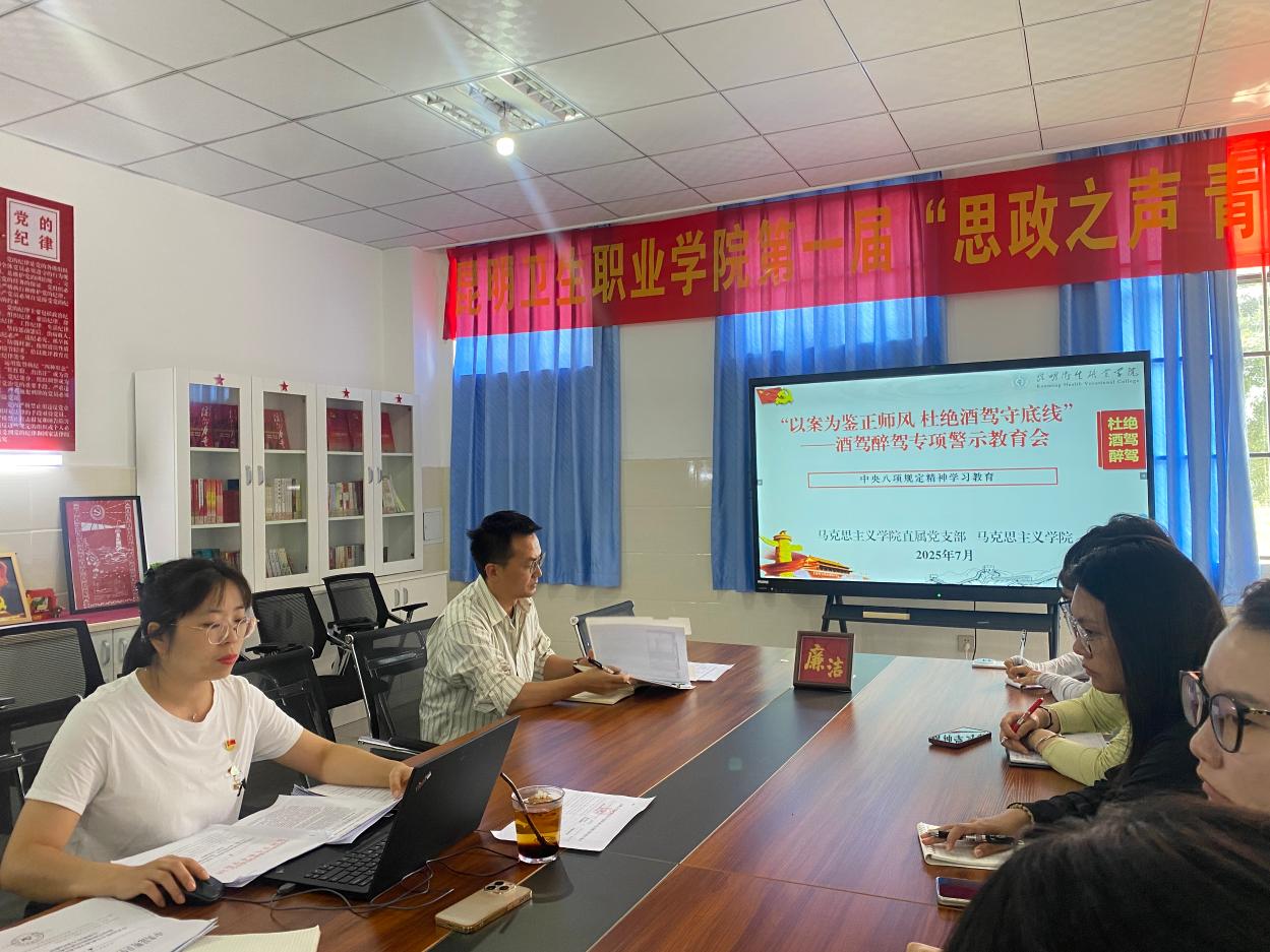 为深入贯彻中央八项规定精神学习教育,严肃纠治违规饮酒问题,强化教师纪法意识与师德师风建设,2025年7月15日,中共昆明卫生职业学院马克思主义学院直属支部委员会召开 “以案为鉴正师风 杜绝酒驾守底线” 酒驾醉驾专项警示教育会。本次会议以支部党员大会扩大会形式举行,参会人员除支部全体党员外,还涵盖学院全体普通教师,由支部书记主持并主讲,马克思主义学院院长作总结强调。