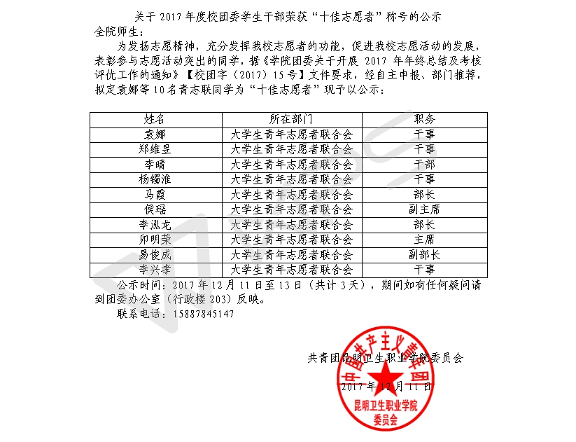关于2017年度校团委学生干部荣获“十佳志愿者”称号的公示