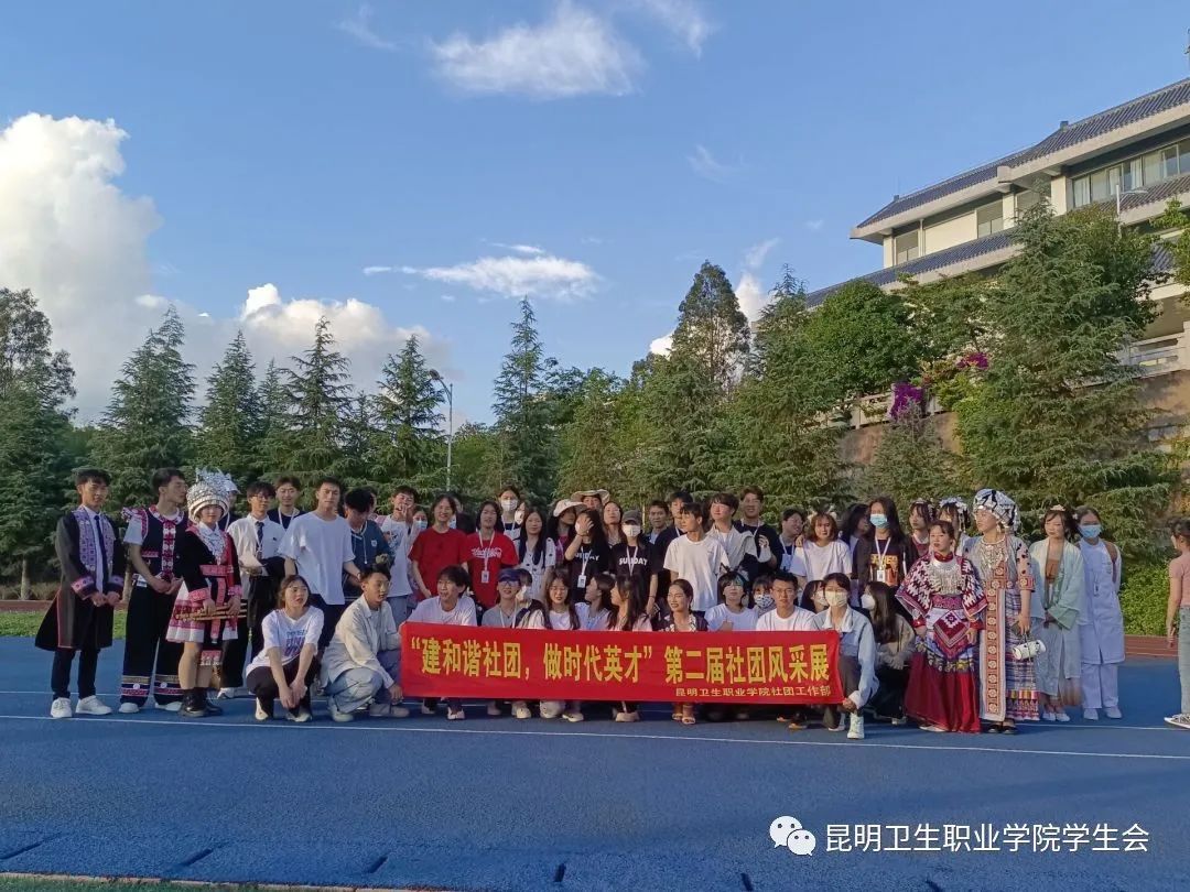 为进一步涵养大学文化,全方位展示学生社团风采,让同学们对各个社团有更深层次的了解,丰富校园文化生活;昆明卫生职业学院于2022年5月27日下午17: 30,在足球场举行了“建设和谐社会,做时代英才”为主题的第二届社团风采展活动。