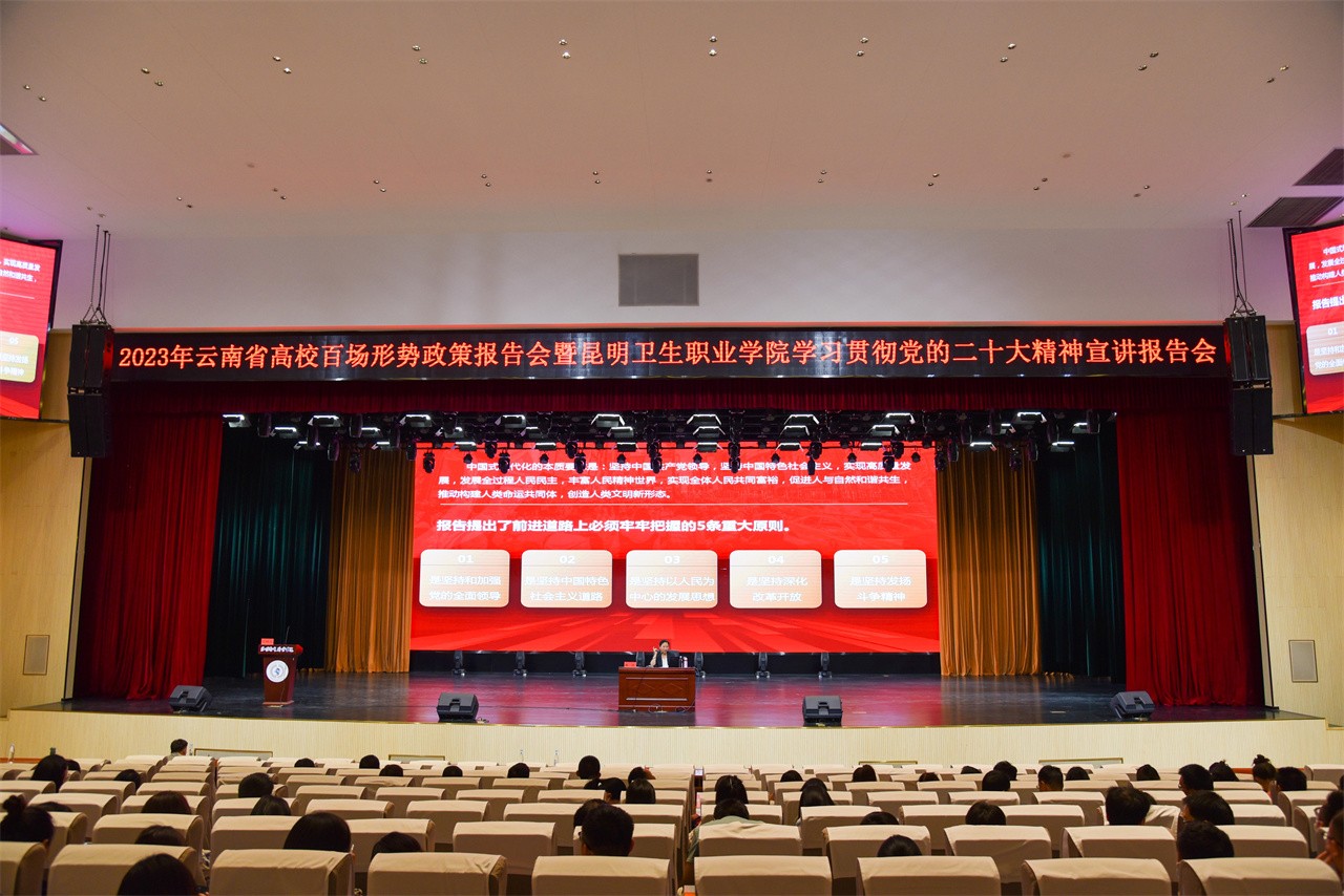 为深入学习宣传贯彻党的二十大精神,全面贯彻习近平新时代中国特色社会主义思想,全面落实立德树人根本任务,引导广大师生深刻领悟新时代新征程中国共产党的使命任务,增强“四个意识”、坚定“四个自信”、做到“两个维护”,5月25日下午,昆明卫生职业学院邀请到云南农业大学马克思主义学院院长杨玲教授作党的二十大精神宣讲暨2023年百场形势政策报告会。