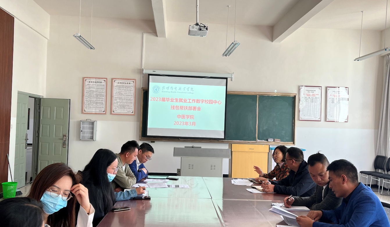 为全面落实党中央、国务院对高校毕业生就业创业工作的决策部署,按照省委省政府、省委教育工委、省教育厅关于做好高校毕业生就业创业工作的指示精神,根据《昆明卫生职业学院关于印发2023 届毕业生就业创业工作实施方案的通知》要求和《昆明卫生职业学院多部门联动帮扶2023届专科毕业生促就业行动方案》,结合中医学院2023届毕业生实际,2023年3月22日上午,中医学院召开数字校园中心挂包帮扶2023届毕业生就业工作部署会,会议由中医党总支书记易斯坐主持,中医党支部副书记余建坤、副院长黄承伟、魏泽正,数字校园中心主任王斌及教师、就业处处长施建飞、辅导员及科任教师出席会议。